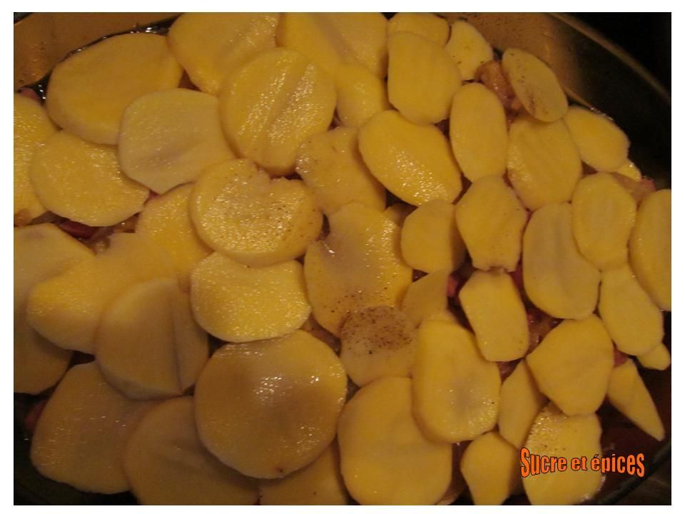 • Faire la même chose encore une fois. Finir par des pommes de terre. Le plat ne doit pas être plein à ras bords, il faut qu’il reste un espace de 1 cm au moins, sinon lors de la cuisson le liquide risque de déborder.